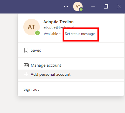 - Klik op je profiel foto of initalen in de rechter hoek van teams. Klik op Set Status Message.