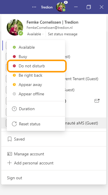 De niet storen status wordt automatisch aangezet wanneer je een scherm aan het delen bent tijdens een Teams vergadering. Maar ook jij zelf kunt deze status aanzetten wanneer je maar wilt. Deze niet storen status zorgt ervoor dat je geen notificaties ontvangt, dus geen chats of belletjes komen tevoorschijn op je scherm. Erg handig als je even gefocust wilt werken.