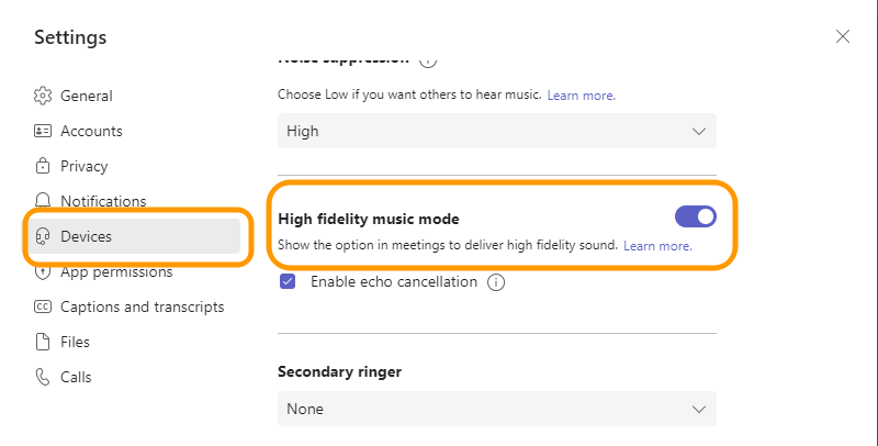 Je gaat naar het kopje “devices” en klikt het knopje om ” high fidelity music mode”.