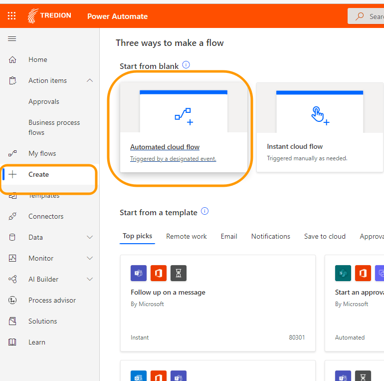 Je gaat naar https://emea.flow.microsoft.com/ waar je in Power Automate terecht komt.