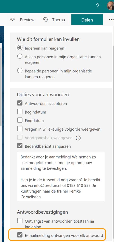Vervolgens kun je naar het Forms Formulier gaan waar je meldingen van wilt onvangen. Je klikt op de drie puntjes en gaat naar instellingen. Je zet het vinkje e-mailmelding ontvangen voor elk antwoord aan. Jij en je de leden van de groep ontvangen nu emailnotificaties wanneer iemand het formulier heeft gebruikt.
