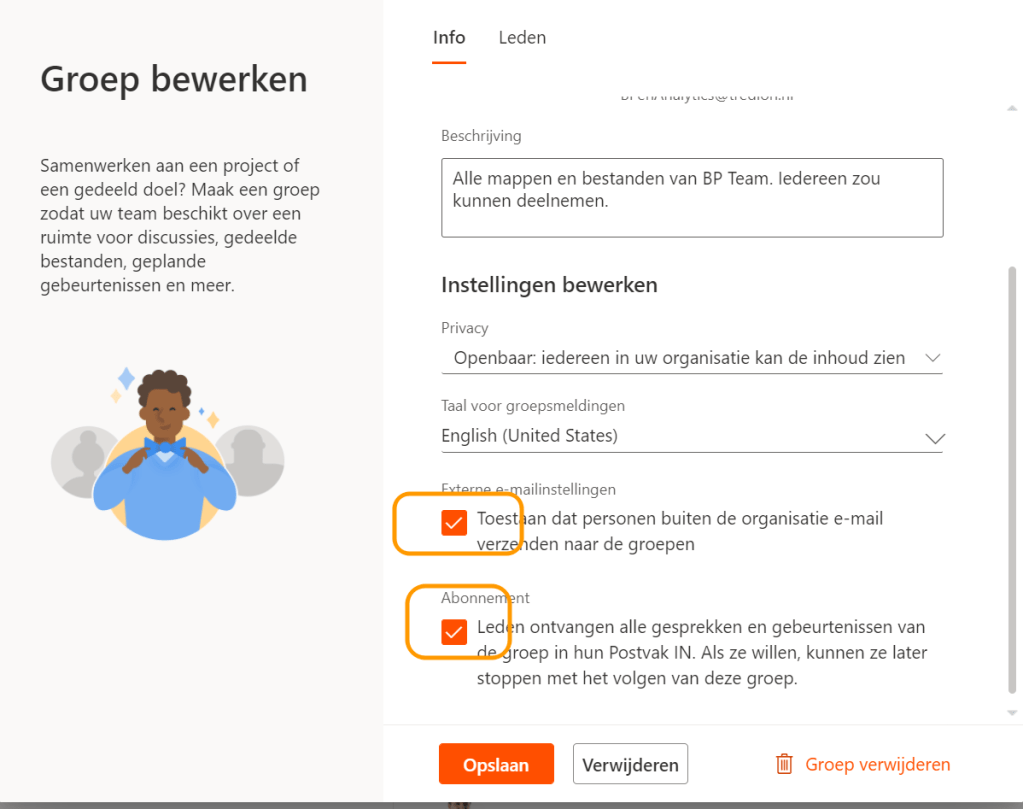 5. Zorg ervoor dat je alle vinkjes aan zet rondom Toestaan dat personen buiten de oragnisatie een e-mail verzenden naar de groepen en Leden ontvangen alle gesprekken en gebeurtenissen van de groep in hun Postvak IN en klik op Opslaan.