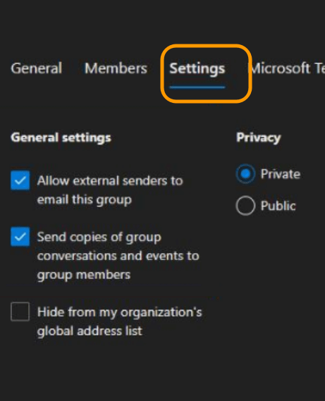 3. Selecteer de vinkjes Toestaan externe zenders om de groep te e-mailen en verzend kopie van groepsgesprekken en evenementen naar leden.
