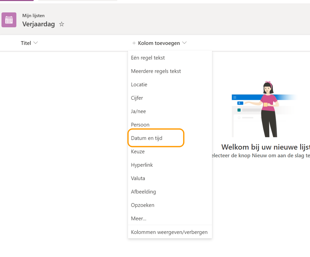 Dan maak je een kolom aan Datum en Tijd en een kolom Persoon. De titel kun je uiteindelijk nog gebruiken voor extra informatie.