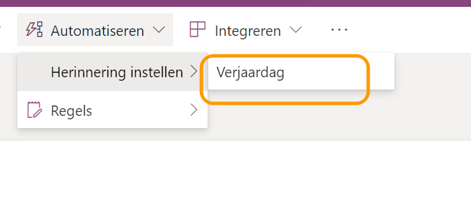 Je kiest bovenin Automatiseren en dan Herinnering instellen en vervolgens kies je de kolom waar de datum aan vast zit.
