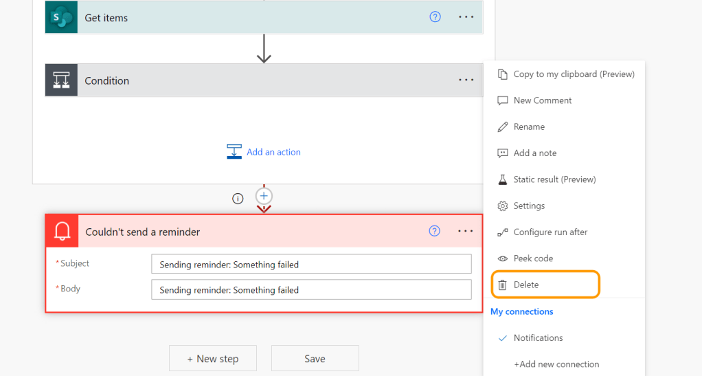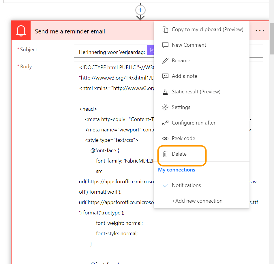 Onderin de stroom kun je de reminder verwijderen. Deze hebben we niet nodig.