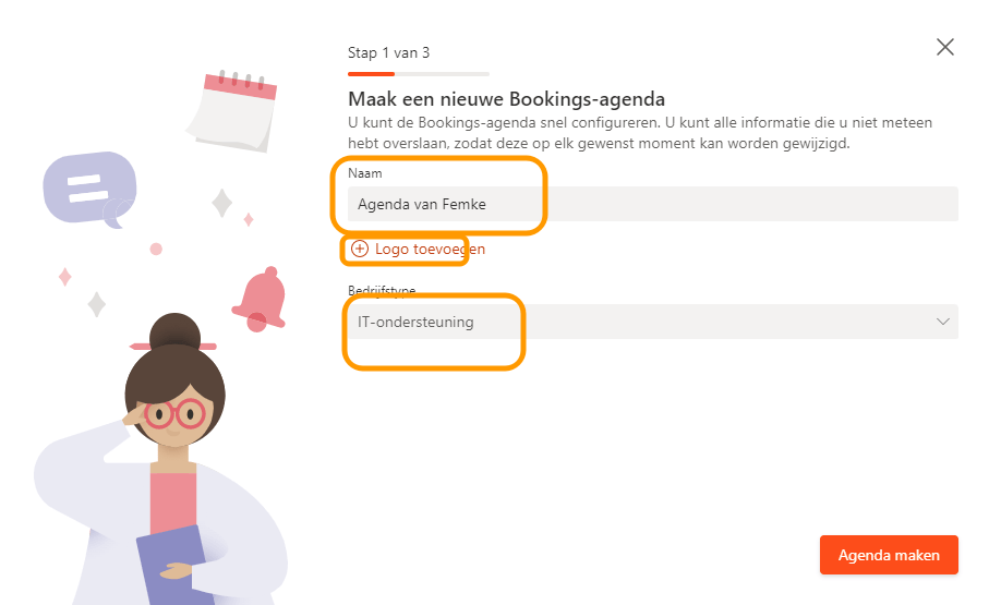 Geef de naam van je agenda op (let op de url kun je later niet meer wijzigen dus denk goed na over je naam). Vervolgens kun je een logo en het bedrijfstype invoeren.