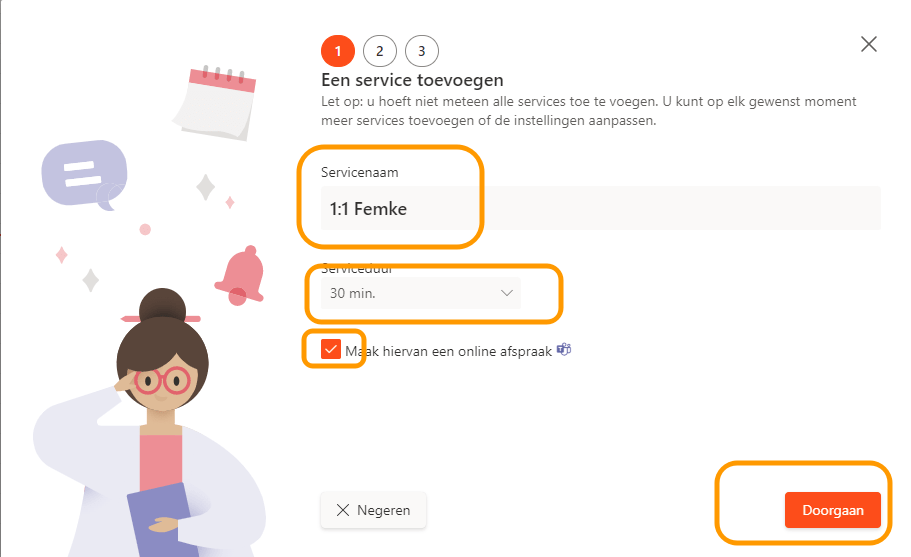 De service kun je aanpassen voor de dienst die jij gaat leveren. Of ook wel de afspraak die je met de andere persoon wilt maken. Je kunt bij de servicenaam het type afspraak neerzetten zoals bijvoorbeeld 1:1 Femke. Door op het potlootje te klikken krijg je meerdere opties te zien en kun je je duur aanpassen van 30 min naar een uur. En kun je zeggen mijn afspraak moet altijd online zijn.