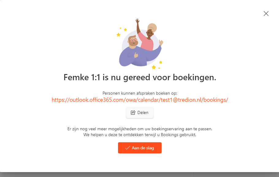 Je pagina is gereed en je kunt nu je pagina delen. De URL komt ook trvoorschijn. Wil je nog verder gaan om je kleuren aan te passen, bedrijfsgegevens zichtbaar te maken of een bevestiging te laten sturen na het boeken van een reserving. Dat kan. Bij instellingen kun je dit soort gegevens nog aanpassen.