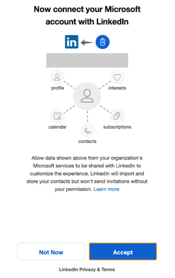 Zo moet je ook weer de andere kant op toestemming geven. Hierdoor kunnen gegevens uit jouw Microsoft-apps worden gedeeld met LinkedIn om jouw LinkedIn-ervaring aan te passen. LinkedIn importeert en onthoud jouw contactpersonen, maar stuurt geen uitnodigingen zonder jouw toestemming.