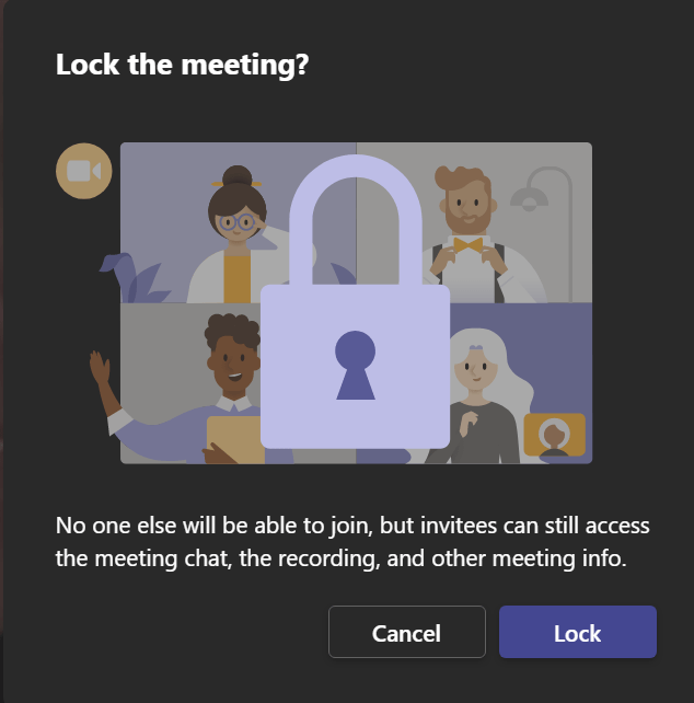 Je krijgt onderstaade melding in beeld. Geen enkele persoon kan meer deelnemen. Wel kunnen de personen die zijn uitgenodigd bij de chat, opname en vergadering info. Klik op “Lock” en je vergadering is vergrendeld.