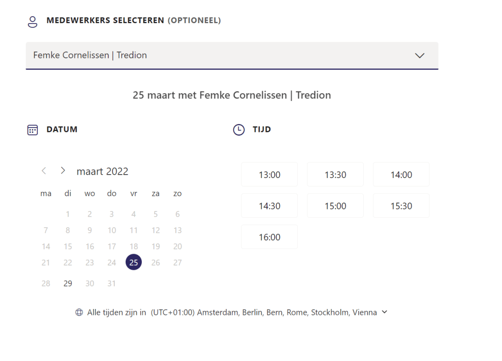 Met Microsoft Bookings kun je verchillende services maken met tijdblokken. Je nieuwe collega ontvangt de Bookings pagina en is zelf verantwoordelijk voor het hele proces. Deze persoon ziet duidelijk wanneer welke collega’s beschikbaar zijn en kan zo alle afspraken zelf inplannen en zich voorzien van informatie over de organisatie. Ook weet deze persoon precies welke personen hij of zij allemaal zal moeten gaan spreken.