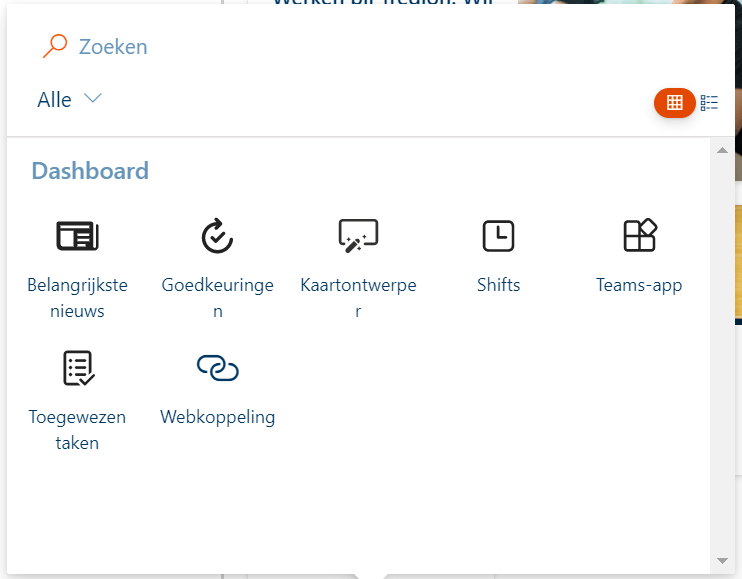 - Ga naar je homepagina waar je reeds Viva Connection in hebt gesteld en klik op het tandwieltje en vervolgens op Viva Connections instellen en Dashboard instellen. De dashboard is hetgene wat je direct ziet op je mobiel wanneer je naar de Viva Connections app gaat in de Microsoft Teams app. Maar ook het Dashboard kunt laten terugkomen in je Intranet pagina.