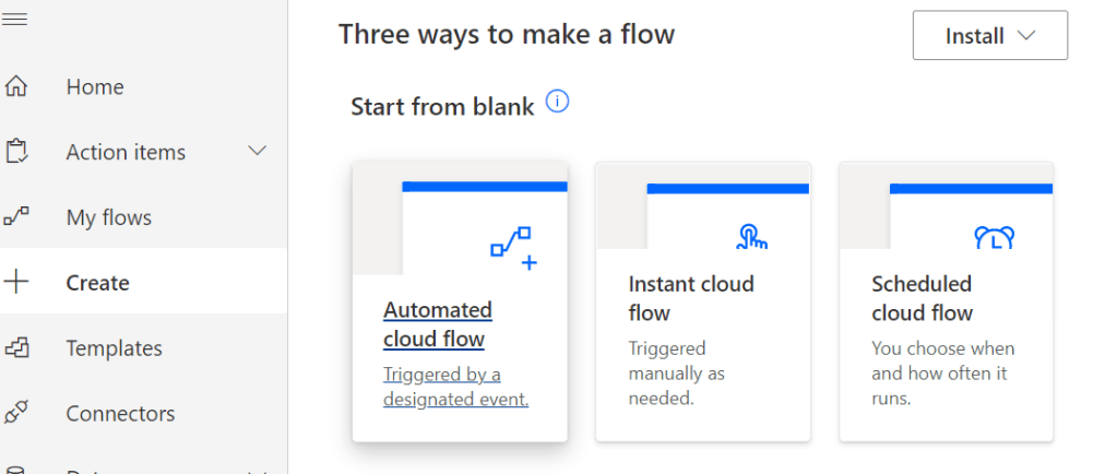 4. Ga naar https://emea.flow.microsoft.com/en-us/. Je Power Automate app. Kies Instant Flow. Dat betekend dat je dus zelf de flow moet triggeren om te laten draaien. Ik kan me voorstellen als je iets elke dag op een bepaald moment binnen wilt krijgen zoals bijvoorbeeld elke dag om 8 uur dat je kiest Scheduled Cloud Flow.