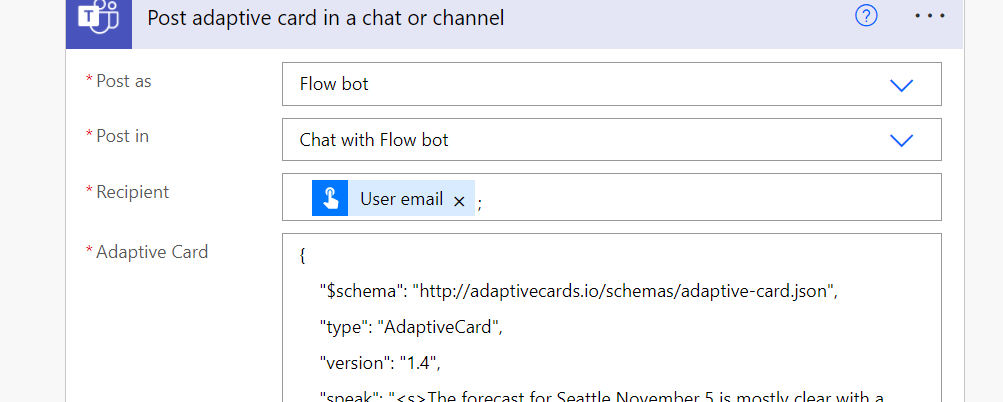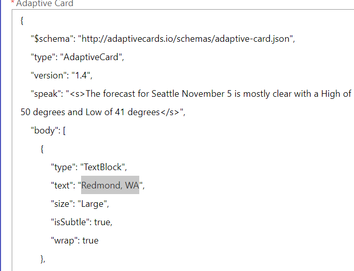 11. We gaan terug naar Post Adaptive Card in a chat or Channel Sectie en daar gaan we de gegevens toevoegen. Je kunt de gegevens Redmond weghalen.