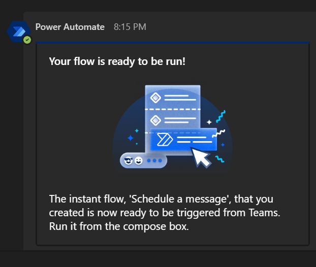 5. Wanneer je bent ingelogd is je flow aangemaakt. Je ontvangt deze melding in je chat vanuit PowerAutomate.