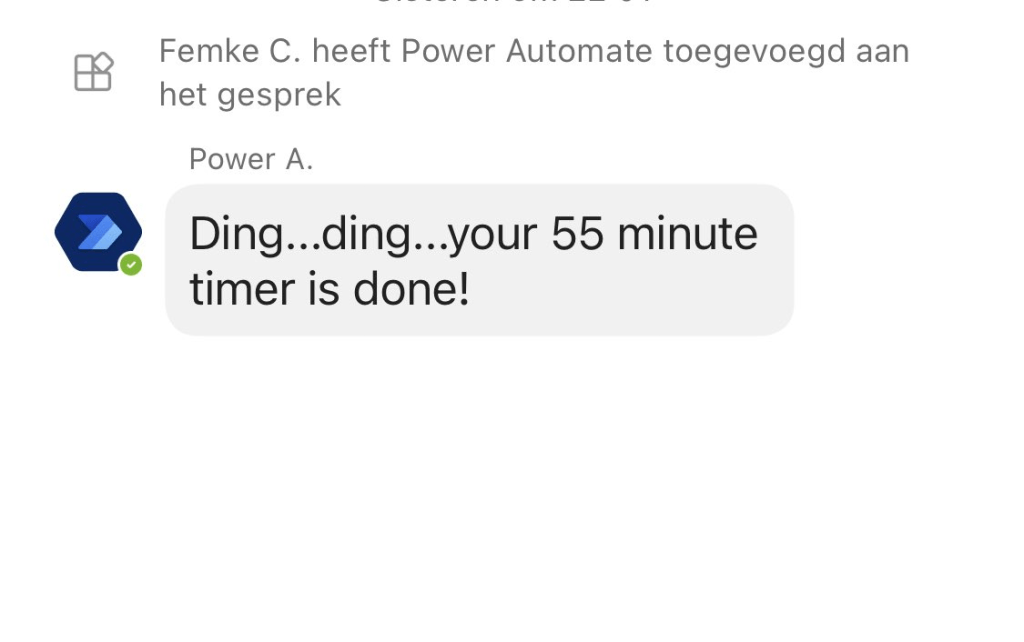 De timer stel je in een chat. Dus doe je wel met een persoon samen. Ik gebruik het ook weleens met mijn persoonlijke teams account zodat dat dan de chat is waarmee “ik samenwerk”. Ik krijg dan vanuit mijn account een melding in Teams dat mijn tijd op is. Mijn Teams heb ik altijd open staan en dat werkt dan dus voor mij persoonlijk fijn! Natuurlijk is deze timer vooral bedoelt om de persoon waarmee jij mee chat een reminder te geven dat jullie tijd op is! Ideaal voor brainstorm momenten waar je maar een bapaald x aantal minuten aan kunt besteden!