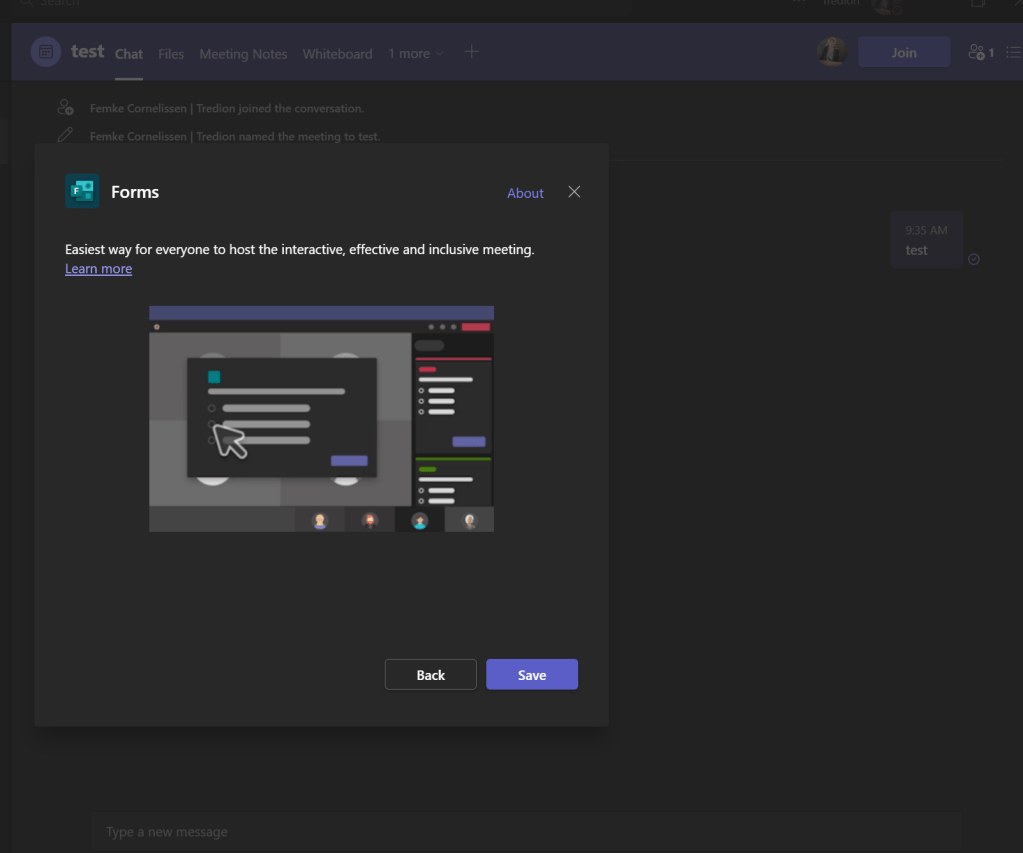 Wanneer je in een chat zit van je vergadering kun je op het plusje drukken en kun je de App Forms aanklikken en deze toevoegen aan de vergadering.