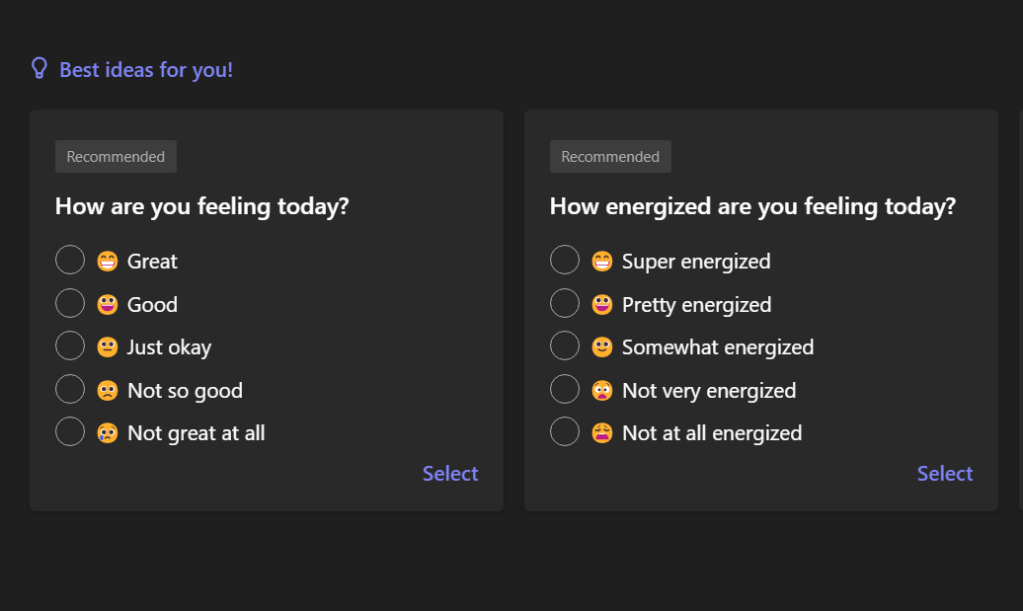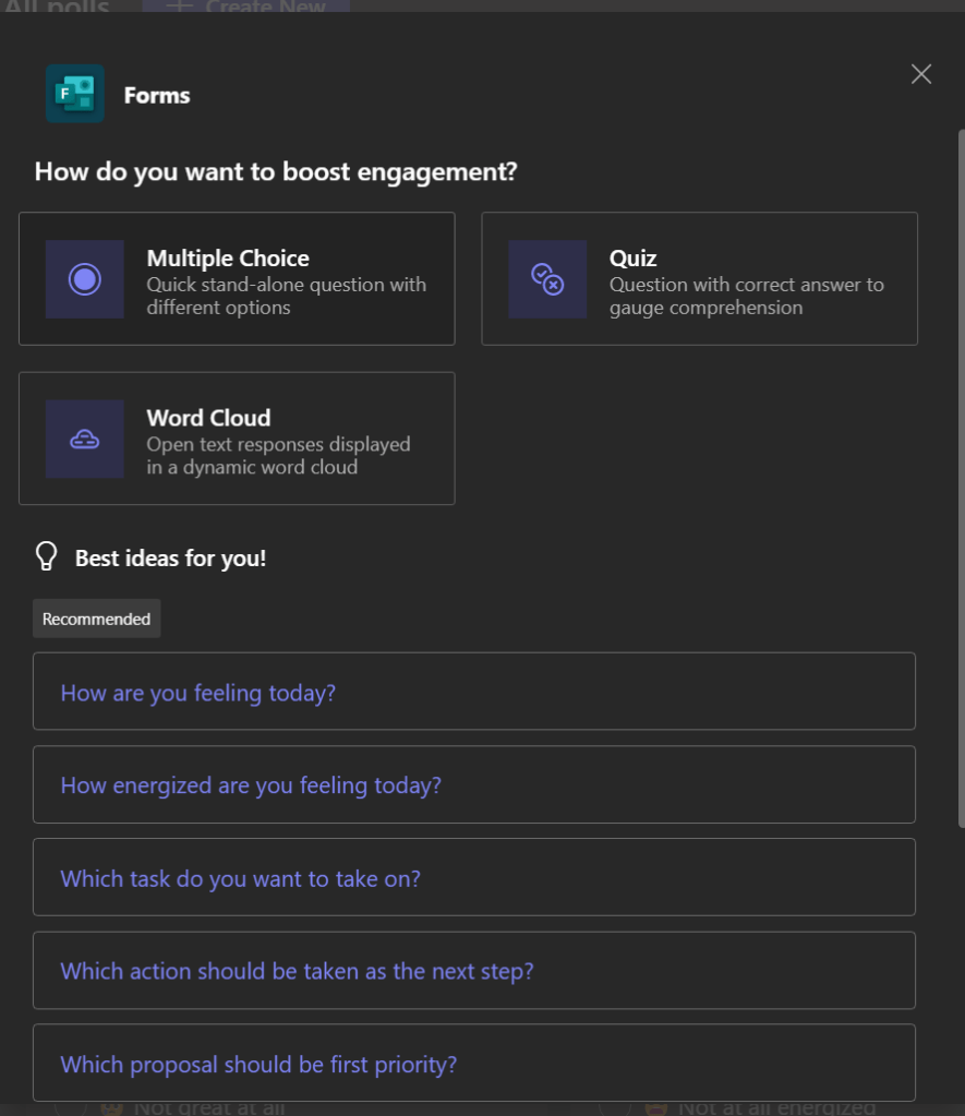 Je krijgt een paar suggesties om te gebruiken. Handig als je tijdens de veradering een Poll kunt inzetten om te weten hoe het met iedereen gaat bijvoorbeeld. Wij starten onze vergadering altijd met welke kleur ben je. Zo heb je een idee hoe het met iedereen gaat en kun je eventueel rekening houden met andere of geef je een momentje om daar iets meer (als je wilt) over te vertellen. Een voorbeeld was bij mij deze week dat mijn kinderen bijvoorbeeld thuis ziek zijn. Toch handig voor je directe collega’s om dat te weten en was ik een klein beetje oranje :). Zo kunnen ze je helpen of is er begrip wanneer je bijvoorbeeld iets verzet of net iets later een reactie geeft dan anders. Je kunt natuurlijk gewoon zeggen hoe het met je gaat door kleuren te noemen. Groen, Oranje of Rood bijvoorbeeld. Maar Forms komt met deze optie voor mij om te delen in mijn vergadering zodat met het niet hoeft te zeggen maar kan invoeren tijdens de start van je vergadering. Dit werkt natuurlijk erg goed als je een Daily Huddle of een Weekly Huddle inzet voor je team.