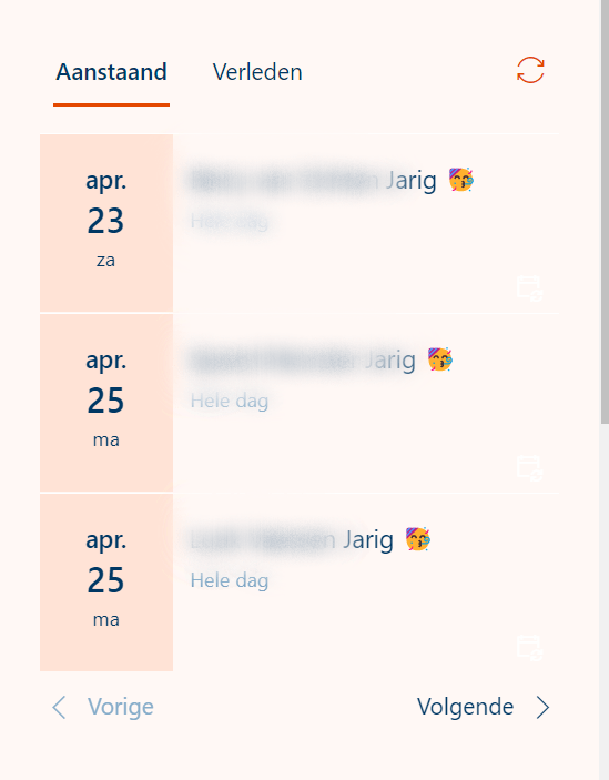 Zo ziet je widget er dan vervolgens uit. Je kunt de agenda in je Outlook toevoegen en daar dan ook verjaardagen inzetten. Uiteraard is dit ook uit te breiden met bijvoorbeeld events en jubileums.