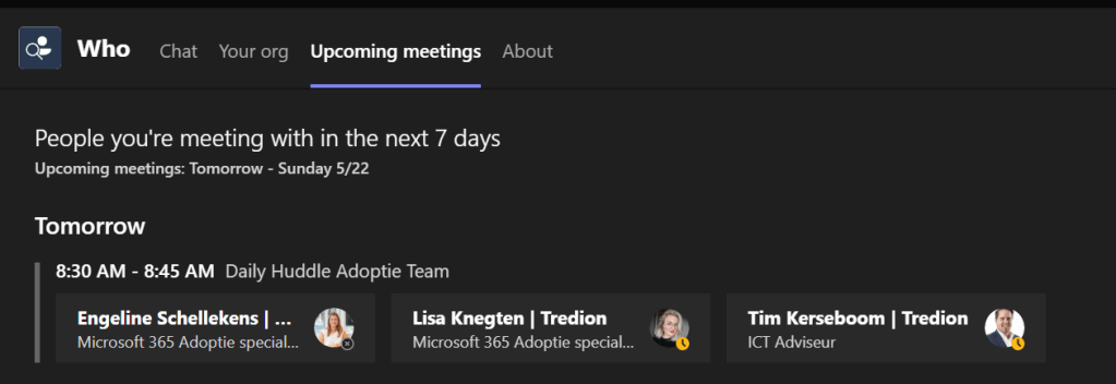 De Who bot is een bot dat beschikbaar is in Microsoft Teams en zorgt ervoor dat jij kunt leren van je collega’s zoals zoeken op skills, welke afdeling een collega werkt of om jou inzicht te geven op je komende vergaderingen en wie daarbij uitgenodigd zijn.