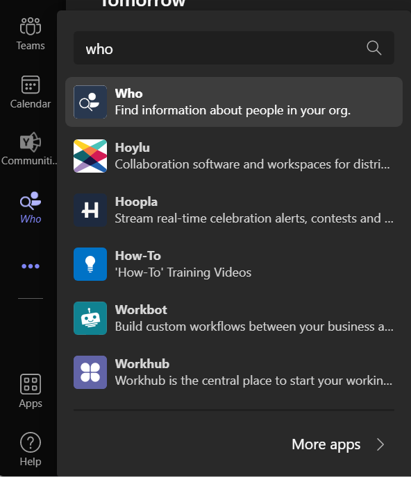 Om de Who bot te vinden klikje op de drie puntjes linksonder in Teams en zoek je op Who.