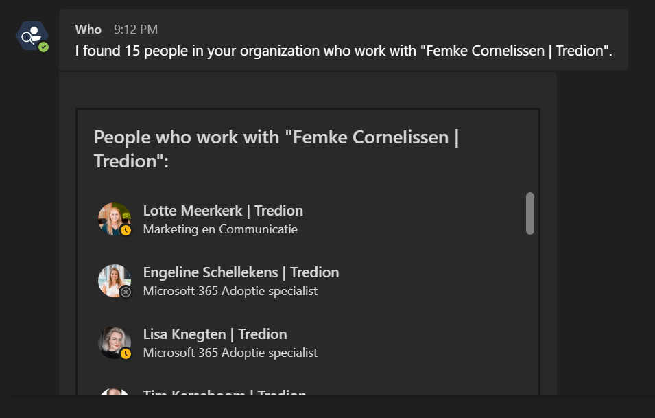 De chat bot zal worden geopend en nu kun je zoeken voor personen in je organisatie. Je kunt bijvoorbeeld vragen aan Who works with Femke.