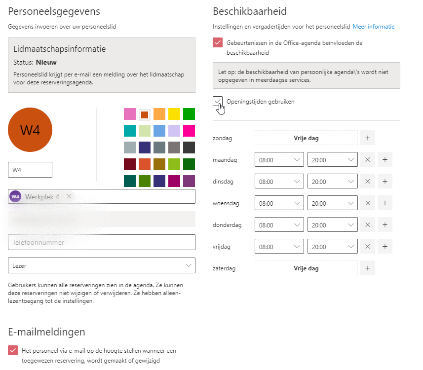 15. Vervolgens open je de Reserveringpagina. Daar zijn ook nog allerlei instellingen mogelijk die naar eigen believe en creativiteit aan te passen zijn.