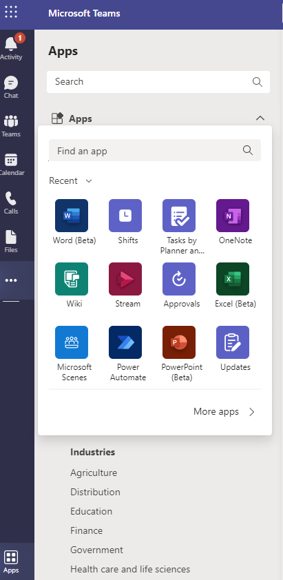 De App kun je toevoegen door links onderin op Apps te klikken en vervolgens te zoeken naar Word, Excel of PowerPoint.