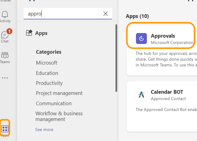 Allereerst ga naar de app goedkeuringen (Approvals). Je kunt dit doen door linksonderin in Teams op Apps te klikken en te zoeken naar Approvals.