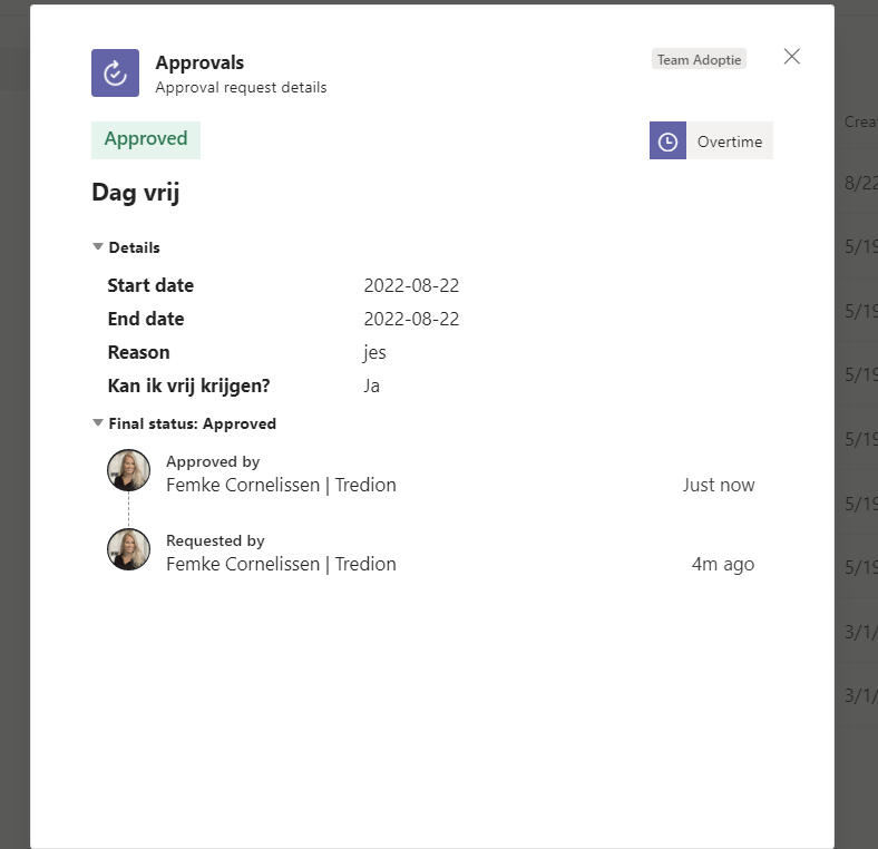 Nu zou je handmatig nog naar de uitkomsten kijken in je Forms formulier. Maar jij zult ook de aanvragen zien in je App waar alle aanvragen zichtbaar zijn. Daarnaast ontvangt de persoon die een goedkeuring moet doen een melding bij Activiteiten in Teams en ontvang jij bij het aanvragen bij een vrije dag wanneer deze is goedkeurd of niet ook een melding.