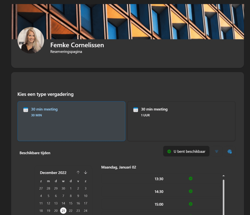 De link kun je delen of zelfs wegzetten in je e-mailhandtekening. Degene die de link hebben ontvangen zien zoals hieronder de tijdstippen en dagen dat jij beschikbaar bent.