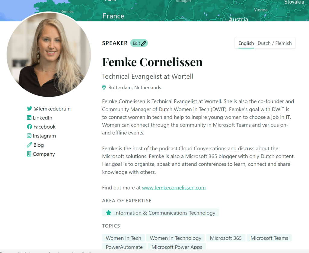 Maak je profiel zo volledig mogelijk. De mijne kun je hier vinden. Als je dit nu al klaar hebt, betekent dit dat het heel makkelijk voor je is om te reageren op oproepen voor sprekers als je ze ziet.