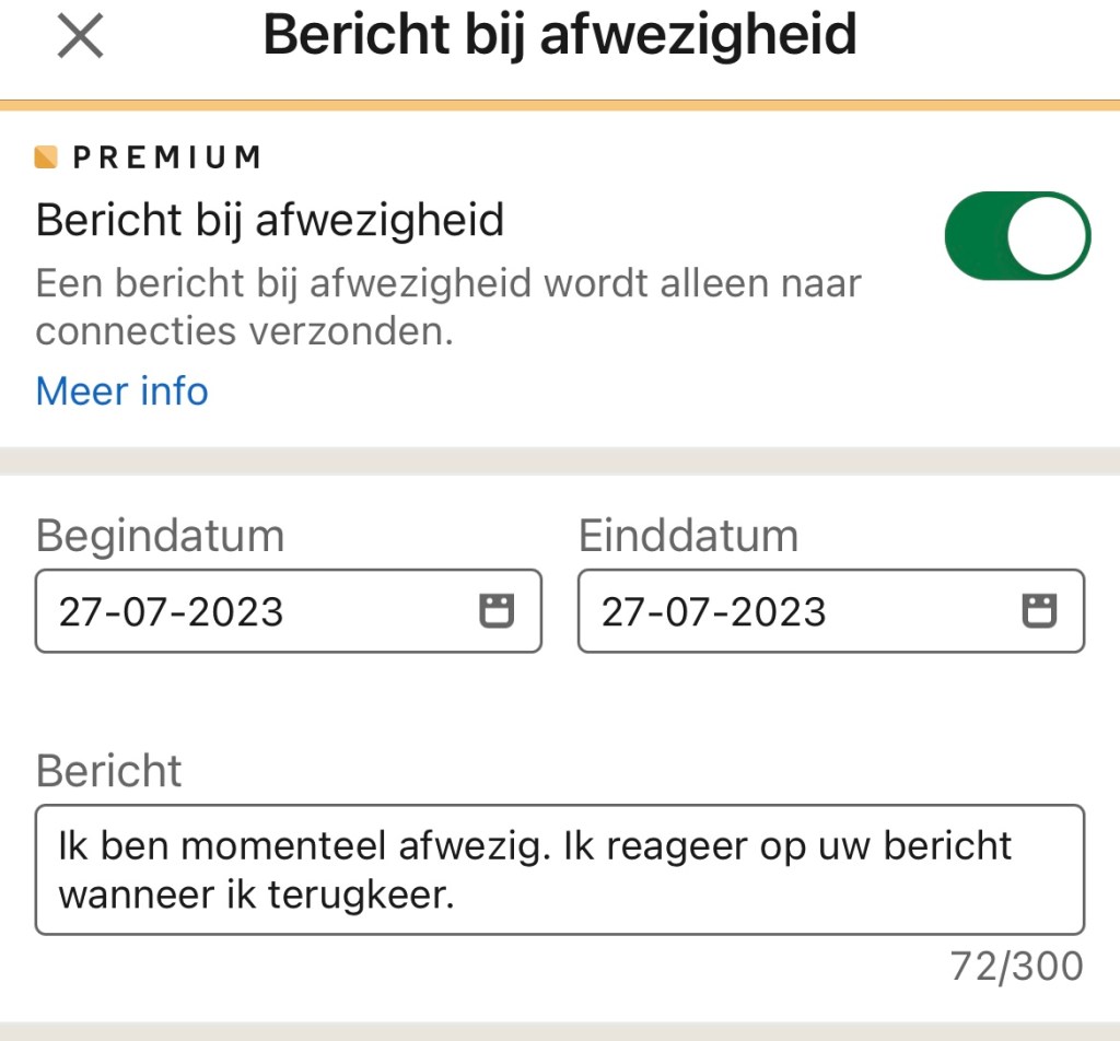 Sinds kort kun je dat dus ook instellen op LinkedIn. Wel alleen als je een premium licentie hebt. Echt handig als je een paar dagen niet bereikbaar bent. Het gaf mij mโn afgelopen vakantie in ieder geval een goed gevoel het aan te hebben staan.