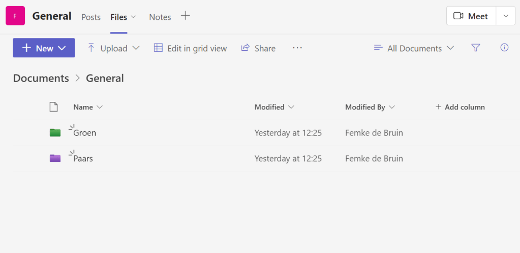 Als je visueel ingesteld bent, kunnen verschillende kleuren je helpen om je bestanden en mappen sneller te identificeren. Het kan ook nuttig zijn als je verschillende soorten documenten in één team of kanaal hebt. Bijvoorbeeld, alle marketingdocumenten in het paars en alle foto’s in het groen.