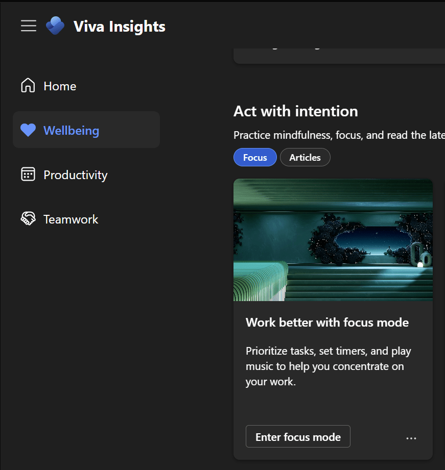 Onder Teams ga ik naar de app Viva Insights. Vervolgens klik op “Wellbeing” en vervolgens de “enter focus modus”.