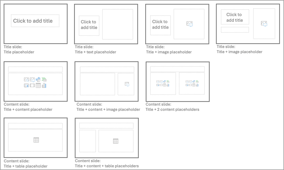 - Inhoudsdia’s: bijvoorbeeld een inhoudsdia met titel en inhoud, een inhoudsdia met een afbeelding, of een inhoudsdia met een tabel.