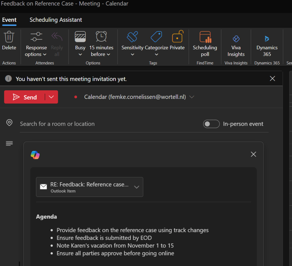 - Check even of de vergaderdetails kloppen – Copilot doet goed werk, maar een snelle blik kan nooit kwaad.